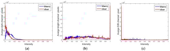 The statistics of the DCP, the BCP and our proposed D/B prior: (a–c) average channel pixels distribution of bright, dark and our D/B, respectively.