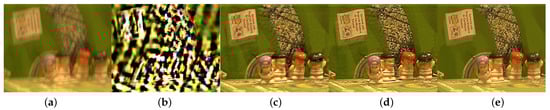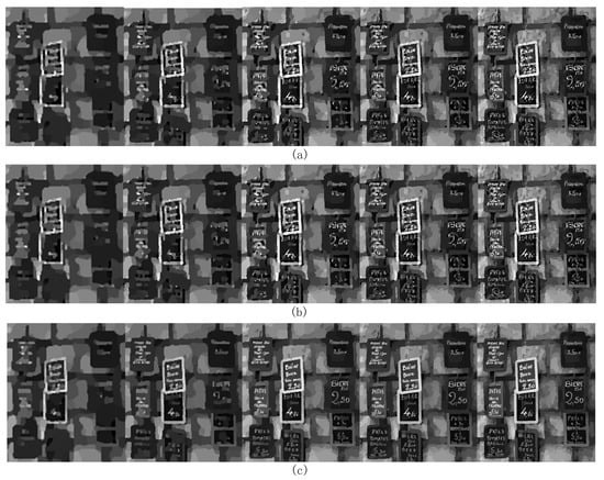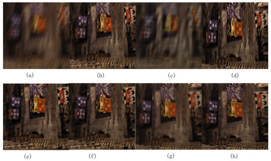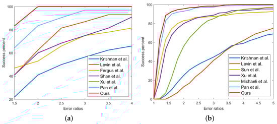 Figure 10 shows the intermediate images of three different methods (Refs. [18,19] and ours). Although the intermediate results become clearer and sharper as iterations increase, the images (Figure 10c) generated by our method have sharper edges and clearer contents than those of Refs. [18] (Figure 10a) and [19] (Figure 10b). Figure 12 shows the results generated by these three methods on some challenging images, including real blurred and low-light images. Our results have fewer blurred areas and ringings, which look more pleasant. Table 2 shows the error ratio of two related approaches [18,19] on dataset [22], and the proposed method fails on one image in which the error ratio value is larger than 4.