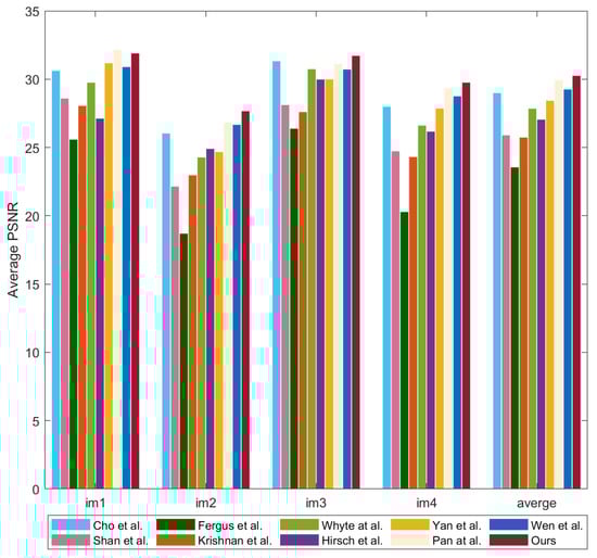 Strong sparsity of image intensity and gradient has been widely used in low-level computer vision processing problems. It also has mature applications in the field of image deblurring [6,11,12,13], such as the [14] norm, the reweighted norm [15], the norm prior [16,17,18,19] and the sparse prior–local maximum gradient (LMG) [20]. For favoring clear images over blurry ones, the edge selection method [21,22,23] is embedded in the blind deconvolution framework. However, strong edges are not always available in many cases. The channel prior was introduced by He et al. for image defogging in Ref. [24]. Then, Pan et al. [18] enforced the sparsity of the dark channel by the norm for kernel estimation. Unfortunately, this prior does not work well on images with large noise and large numbers of pixels. To solve this problem, Yan et al. [19] proposed an extreme channel prior (ECP) which utilizes both the dark channel and bright channel for estimating the blur kernel.