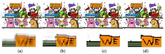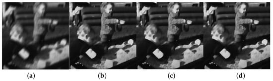We further carry out experiments of our method against the state-of-the-art approaches [16,19] on text images from the dataset [16]. This dataset consists of 15 images and eight different kernels ranging in size from to . Figure 6 visually shows that our method performs well on a challenging blurry image in comparison with [19] and the method designed for text images [16]. As shown in the figure, the DCP and ECP also help the blind deblurring of text images. Our deblurred result in Figure 6d utilizing the proposed D/B generates sharper edges and clearer text compared to other results [16,19]. Another text example is shown in Figure 7. Note that the text becomes extremely sharper after the deblurring process, which demonstrates that our proposed norm based on the D/B is helpful for kernel estimation and image deblurring. In particular, sharp text images contain more salient edges in local patches, which drives our D/B to perform well. Table 1 presents the average PSNR values of the deblurred results on the text image dataset [16] compared with the state-of-the-art methods. Our method achieves the maximum PSNR value.