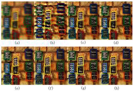Visual comparison of the results using one challenging image from dataset [44]. The image (a) is blurry input; (b–h) are deblurring results of Ref. [21], Ref. [27], Ref. [14], Ref. [48], Ref. [18], Ref. [19] and our proposed method, respectively.