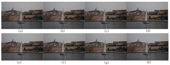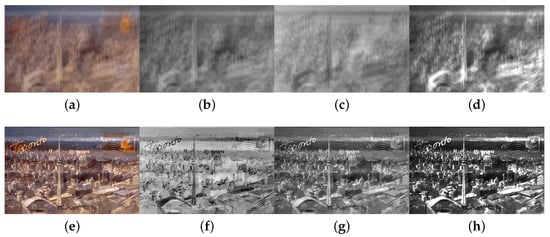 where x and y denote the coordinates of the pixel, is a non-negative constant and represents an image patch centered at x. is the c-th color channel of image I. As described in Equation (3), represents the BCP and represents the DCP. Dark channels are obtained by two minimization operations: and . The bright channel is obtained by two maximization operations: and . In the implementations of the DCP and BCP, if I is a gray image, then only the latter operation is performed. A small value of implies there are salient edges in the image patch. On the contrary, a large implies that there are fine structures in an image patch. The reason is that when the edge is salient, the pixel values are more different between the two sides of edges. It means that the minimum value is more different from the maximum value of the image patch. Conversely, when the difference between the DCP and BCP is not that large, the image edge is unclear, and the value of is large. Therefore, it is natural to think that if the DCP is equal to or slightly smaller than the BCP, small edges can be accurately removed by minimizing Equation (3).