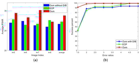 In this subsection, experiments are conducted to verify the performance of the proposed D/B for blind image deblurring. As mentioned above, the proposed D/B regularization term considers the contrast and salient edges’ information in local patches. To demonstrate the effectiveness of the proposed prior, we compare the proposed method with the DCP-based method [18] and the ECP-based method [19] in image deblurring. Figure 10 shows the changes of the DCP, the BCP and the proposed sparse channel prior in each phase of the image. Initially, the contrast and clarity of the DCP, the BCP and the proposed sparse channel prior of the proceeding blurred images are very low, while the contrast of the middle layer is significantly improved and the final restored images have a higher contrast and sharper contour. At this time, the ringing and artifacts in the images are greatly reduced. Note in each stage, the proposed sparse channel prior has a clearer outline than the DCP and BCP. Compared with the literature [18], the proposed method estimates the blur kernels better with less artifacts. Figure 11 shows the quantitative evaluations on the benchmark dataset [12] by the ECP and our method with and without the proposed D/B. Note that the PSNR (Figure 11a) of the proposed D/B-based method is higher than that of the ECP and our method without D/B. Moreover, our method with the proposed D/B prior performs more favorably in terms of error ratio (Figure 11b) than without the D/B regularization, which further demonstrates the effectiveness of the proposed D/B-based methods. The proposed D/B-based algorithm generates the results with PSNR values higher than the other two methods.