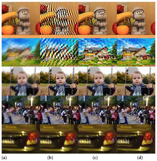 - Köhler, R.; Hirsch, M.; Mohler, B.; Schölkopf, B.; Harmeling, S. Recording and playback of camera shake: Benchmarking blind deconvolution with a real-world database. In European Conference on Computer Vision; Springer: Berlin/Heidelberg, Germany, 2012; pp. 27–40. [Google Scholar]