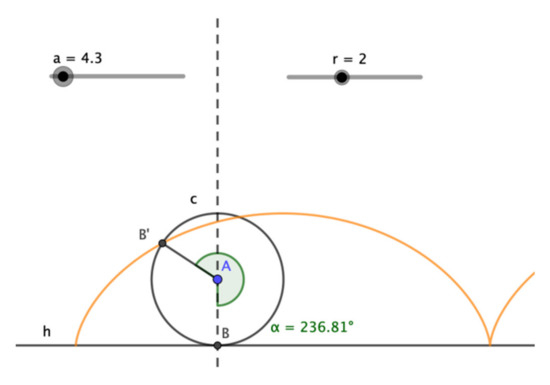 Before the tasks were designed, and during twelve 90 min sessions, the participants worked to construct and explore various geometric configurations in the DGS environment related to problem solving (with and without extra-mathematical context). In these sessions, participants were introduced to using and experimenting with various DGS components, such as the point, point-on-object, line-through-two-points, angle, slider, locus, and conic tools, and the mathematical definitions associated with the DGS tools were presented. In addition, relevance was given to identifying relationships between objects and conditions that can be used to move geometric constructions, as in a type of hierarchy or nesting of the objects used in the construction. For example, the following process related to Figure 2 allows represent the movement of a wheel: Using the slider tool, a circumference C with center A and radius r is constructed. The circumference is intersected by the horizontal line h, yielding point B. Then, with the angle tool and given its amplitude (-a/r), point B′ is constructed. Now, when slider a is moved, the circle slides horizontally and point B′ moves by the angle α, generating “the illusion” of rolling the circle and the locus of the cycloid described by B′.