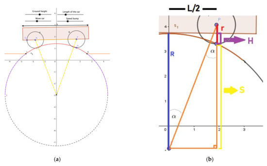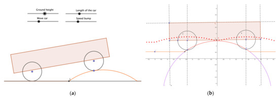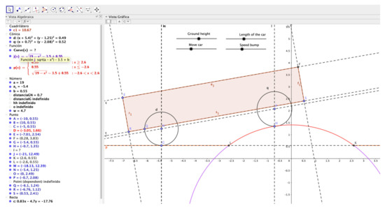 Although it is not the focus of this research, difficulties are also evident in the construction of the simulations. For example, it was not possible to fully convey visually the circles that represent the wheels as being tangent to the arc that represents the speed bump, while also keeping the circles tangent to the ground (represented by the graph of a linear function) (Figure 5b). However, the problem can be solved mathematically by assuming that the circles are tangent (Figure 7b), without forgetting that in reality the tangency at a point does not occur.