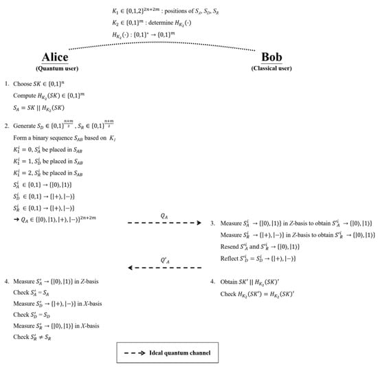 However, these QKD protocols [2,3,4,5,6,7,8,9,10,11,12,13] typically assume that both participants have the requisite hardware, which is not a practical assumption as quantum computing hardware is prohibitively expensive. With an aim of increasing the accessibility of these protocols for everyone, Boyer et al. [14] proposed the first semi-quantum key distribution (SQKD) protocol in 2007. Boyer et al. [15] specified an environment that involves two types of participants: one with unlimited quantum capabilities and the other with classical capabilities and limited quantum capabilities, where the user Bob is considered a classical user and the user Alice possesses full quantum abilities. In Boyer et al.’s SQKD protocol [15], Bob can possess three of the following abilities: (1) Z-basis (i.e., ) measurements, (2) generating Z-basis qubits, (3) reordering qubits using different delay lines, and (4) reflecting qubits without disturbance. Boyer et al. mentioned two types of SQKD protocols: randomization-based and measure-resend. In the measure-resend SQKD protocol, classical user Bob is allowed to perform: (1) Z-basis measurement, (2) generating Z-basis qubits, and (4) reflecting qubits. In the randomization-based SQKD protocol, Bob performs: (1) Z-basis measurement, (3) reordering qubits using different delay lines, and (4) reflecting qubits. After the proposal, miscellaneous protocols have been applied within a ‘semi’ environment (e.g., SQKD protocols [16,17,18,19,20,21,22,23,24,25,26,27,28,29,30,31,32,33,34,35], semi-quantum secret sharing protocols [36,37,38,39], and semi-quantum secure direct communication [40,41,42,43,44]).