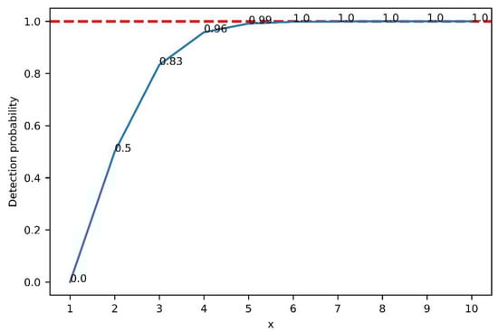 Assume Eve attempts to perform an intercept and resend attack on the traveling particles in , to obtain Alice’s secret key, . To perform the attack, Eve intercepts and and resends the fake single photons randomly chosen from four different states (i.e., ), trying to forge the identity of Alice in Step 2. In Step 4, Bob checks the hash value of , which infers that Eve must obtain all the particles’ positions to pass the check. However, Eve does not know the corresponding positions of each photon in and . Then, Eve has a probability of to pass the eavesdropping check, where x represents the total number of (i.e., in the proposed ASQKD protocol). Thus, the probability for Eve to be detected in Step 4 is . If x is large enough, the detection probability would converge to 1, as shown in Figure 2.