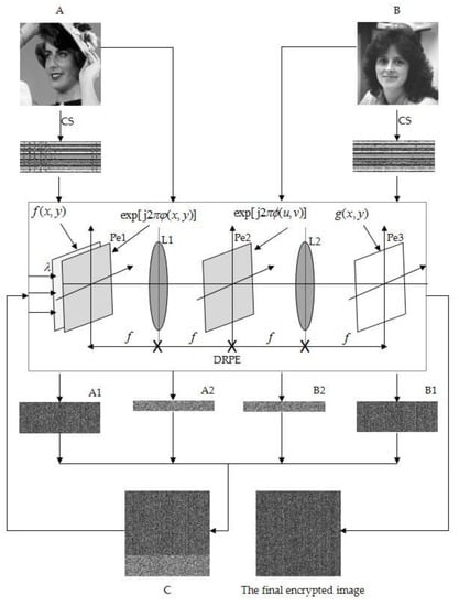 The proposed double image encryption scheme based on CS and DRPE includes two main stages: the encryption stage and the decryption stage. In the encryption stage, the two original images A and B are compressed and sampled (encrypted), respectively, through CS, and then DRPE is performed to obtain two small-sized images, A1 and B1. Meanwhile, the two original images are directly encrypted with DRPE to obtain the authentication information, A2 and B2. Next, the two small-sized images (A1 and B1) are combined with the authentication information of the two images (A2 and B2) into an image C, and we finally perform DRPE on C to obtain the final encrypted image. The decryption process is the reverse process of encryption. Figure 1 shows the overall framework of the encryption process.