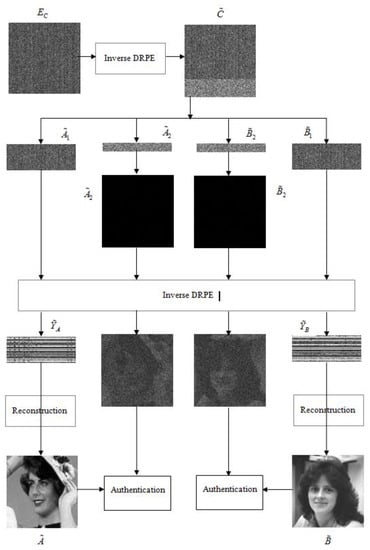 Step 7: The same as Step 1 of the decryption process. The frequency-domain decryption key for DRPE decryption is calculated. Using the algorithm of Step 2 in the decryption process, DRPE decryption is performed on and , and the authentication information and for detection and authentication are obtained, respectively.