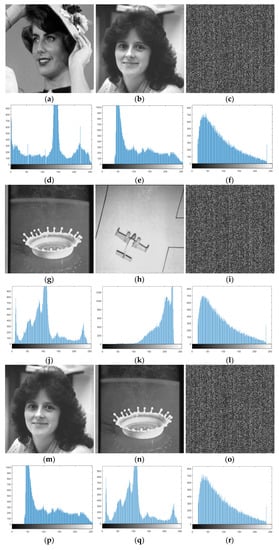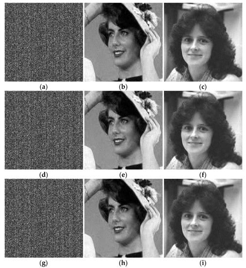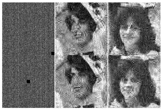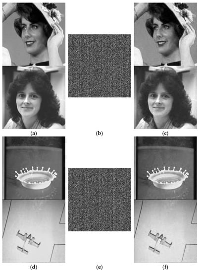 From the perspective of encryption performance, it is impossible to obtain any valuable information from the encrypted image. Encrypt two original images with a size of into an encrypted image with a size of , and the storage space occupied by the encrypted image is only half of the original images. It can be seen that the encryption performance and compression performance of the proposed scheme were verified. Next, we mainly use visual effects and peak signal-to-noise ratio (PSNR), a commonly used evaluation indicator of decrypted image quality, to evaluate the quality of the image decrypted and reconstructed with the correct key. In terms of visual effects, the decrypted and reconstructed image in column 3 is very similar to the original image in column 1, and the main information in the original image can be clearly identified in the decrypted and reconstructed image. From the value of peak signal-to-noise ratio, the PSNR of the decrypted and reconstructed images are both greater than 30 . In addition, since the proposed scheme is to encrypt two images into one image, we deliberately set up comparative simulation experiments to investigate whether the two images affect each other’s decryption and reconstruction image quality. Through experiments, it can be seen that the quality of the reconstructed image has nothing to do with the partner image when not being attacked. For example, the PSNR of the reconstructed and decrypted image after encrypting image Woman and Lady together is 32.8682 , and the PSNR of the reconstructed and decrypted image after encrypting image Woman and Milkdrop together is 32.9014 . The difference between the two is only due to the quantization error in both the encryption process and decryption process.