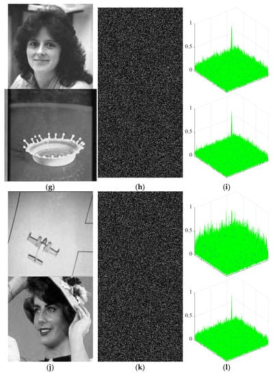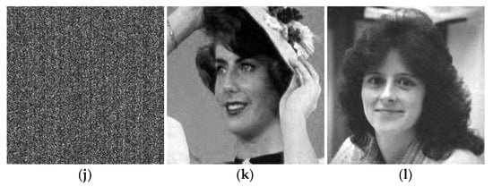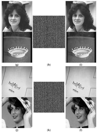 Effectiveness evaluation of the proposed scheme. (a) Original images Lady and Woman, (b) encrypted image, and (c) reconstructed images Lady (PSNR: 30.2424 dB) and Woman (PSNR: 32.8682 dB). (d) Original images Milkdrop and Airplane, (e) encrypted image, and (f) reconstructed imagesMilkdrop (PSNR: 32.740 dB) and Airplane (PSNR: 33.6446 dB). (g) Original images Woman and Milkdrop, (h) encrypted image, and (i) reconstructed images Woman (PSNR: 32.9014 dB) and Milkdrop (PSNR: 32.7725 dB). (j) Original images Airplane and Lady, (k) encrypted image, and (l) reconstructed images Airplane (PSNR: 33.6833 dB) and Lady (PSNR: 30.3596 dB).