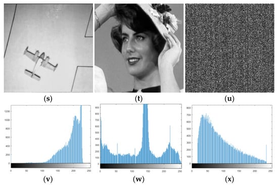Histogram analysis. (a) Original image Lady, (b) original imageWoman, (c) encrypted image 1, (d) the histogram of Lady, (e) the histogram of Woman, (f) and the histogram of encrypted image 1. (g) Original image Milkdrop, (h) original image Airplane, (i) encrypted image 2, (j) the histogram of Milkdrop, (k) the histogram of Airplane, and (l) the histogram of encrypted image 2. (m) Original image Woman, (n) original image Milkdrop, (o) encrypted image 3, (p) the histogram of Woman, (q) the histogram of Milkdrop, and (r) the histogram of encrypted image 3. (s) Original image Airplane, (t) original image Lady, (u) encrypted image 4, (v) the histogram of Airplane, (w) the histogram of Lady, and (x) the histogram of encrypted image 4.
