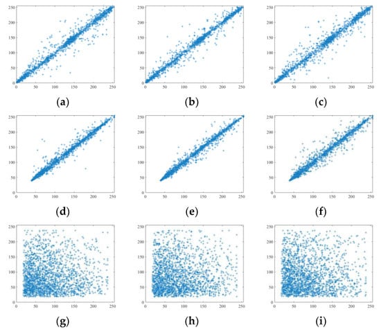 Correlation analysis: (a–c) horizontal direction, vertical direction, and diagonal direction in plain image Lady; (d–f) horizontal direction, vertical direction, and diagonal direction in plain image Woman; (g–i) horizontal direction, vertical direction, and diagonal direction in encrypted image.