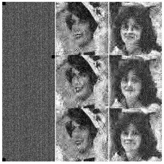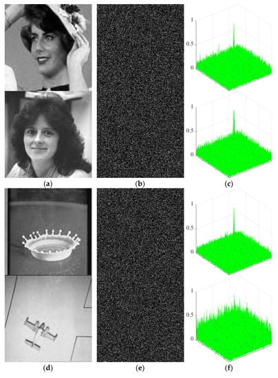 Based on the theoretical analysis of the proposed scheme, the encryption effects of this scheme come from the dual effects of CS and DRPE. Figure 3 shows the relevant experimental results. From left to right, the first to third columns correspond to the original images, the encrypted image, and the reconstructed image with the correct secret key.