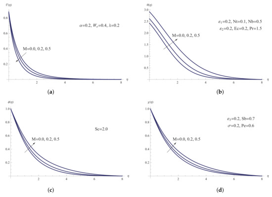 The graphical representations of the resulting equations, which are calculated under the effect of appropriate values of the relevant flow controlling parameters, have been presented in this section. These physical parameters are used in the ranges as and . As a result, for graphical display, the values of the parameters with fixed values are , and . Figure 2 shows the effect of the magnetic parameter M on the dimensionless velocity , dimensionless temperature , dimensionless concentration , and dimensionless microorganisms profile , respectively. The dimensionless velocity of Williamson nanofluids moving under the influence of a magnetic field decreases as the magnetic parameter increases, whereas the reverse tendency is observed for dimensionless temperature, dimensionless concentration, and dimensionless microorganisms. Physically, the presence of a magnetic field produces a resistive force known as the Lorentz force. This force causes the breadth of the momentum layer to narrow and the temperature of the thermal layer to rise.