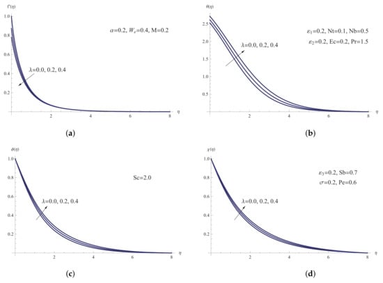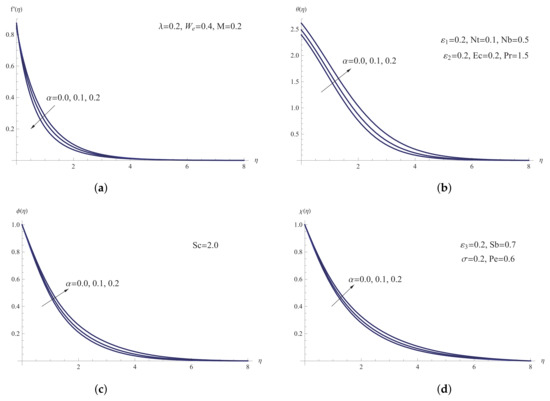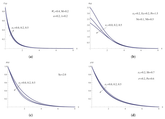 Figure 3 depicts the effect of the slip velocity parameter on the curves of nanofluid velocity, nanofluid temperature, nanofluid concentration, and nanofluid microorganisms. We can see that increasing the slip velocity parameter significantly dampens the nanofluid flow in these plots. Further, as they approach the free stream, the temperature profiles, concentration profiles, and motile microbe species concentration all show smoothness, and they all show enhanced behavior when the same parameter is increased. Furthermore, the validation of the behavior of the velocity distribution under the impact of the slip velocity parameter is confirmed by recalling the study of Khan et al. [27].