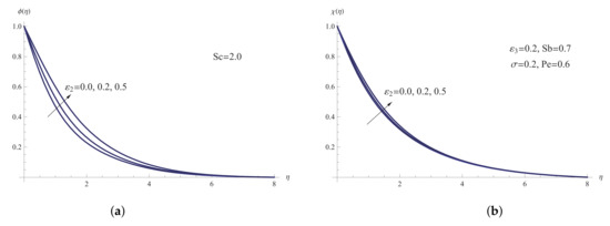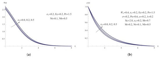 Figure 6 elucidates the physical aspects’ impact of the mass diffusivity parameter on both the concentration and microbe species concentration profiles, respectively. Clearly, both and present an enhancing variation with the presence of the mass diffusivity parameter . Likewise, Figure 7a depicts the variations in the temperature profile as a function of . When the mass diffusivity value is increased, the magnitude of the sheet temperature is clearly restricted, and it is dramatically intensified as this parameter is increased.