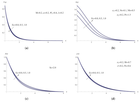 Finally, Figure 8, elucidates the impact of the Eckert number on the velocity , temperature , concentration , and the microbe species concentration profile plots, respectively. The bigger the value of , the higher the temperature, sheet temperature , concentration, and microbe species concentration sketches. The physics underlying this is that more energy is passed from surface to fluid due to a higher viscous dissipation phenomena. Furthermore, the velocity sketch decreases due to larger estimates of the Eckert number , as seen in the same figure. The heat source resulting from the transformation of kinetic energy into internal thermal energy due to viscous stresses is accounted for by the viscous dissipation phenomena. Physically, the presence of viscous dissipation indicates the formation of thermal energy, which raises the sheet temperature, the thickness of the thermal boundary layer, and the temperature distribution.