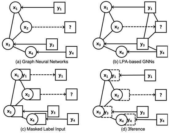 Figure 2. The difference among conventional end-to-end models including GNNs, LPA-based GNNs, Masked Label Input methods, and 3ference. (a) Graph Neural Networks learn to combine node features (denoted as circles) and their structures (denoted as unidirectional edges between circles) under the supervision of known labels (denoted as solid directional arrows and rectangles). Then, they assign labels (such as y 2 ) to a node according to its features and the features of its adjacencies ( x 1 , x 2 , x 3 in the illustrated example if the GNN is a one-layered GCN). The inference phase is represented with dashed directional arrows. (b) LPA-based GNNs also consider the structural information of labels. However, the pattern of labels is assumed. (c) Masked Label Input methods divide known labels into inputting labels ( y 1 ) and supervising labels ( y 3 and y 4 ). Supervising labels are masked to avoid the label leakage issue. In this illustrated example, y 2 is estimated using x 1 , x 2 , x 3 , and y 1 if the GNN is a one-layered GCN. (d) Our method, 3ference, infers by transforming related labels and approximating the differences. It estimates y 2 using x 1 , x 2 , x 3 and y 1 , y 3 .