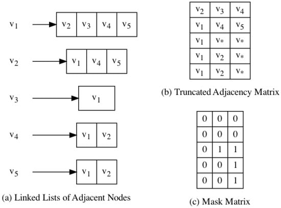 Figure 4. An example of constructing the Truncated Adjacency Matrix and the Mask Matrix. (a) In this graph, connections are represented with linked lists. v 4 is connecting to v 1 and v 2 . (b) Therefore, there is a padding element v * representing a node at the end of the 4th row in the truncated adjacency matrix. (c) To omit this padding element in batched computing, we set the (4, 3) element in the Mask Matrix to 1.