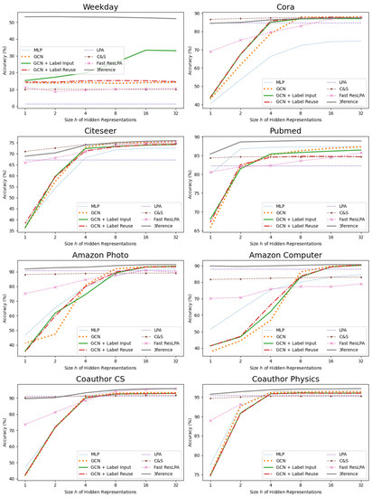 Figure 5. Accuracy scores (%) for Node Classification when the size h of hidden representations changes. We implemented all methods while maintaining their amounts of parameters roughly the same when their hs are equal.