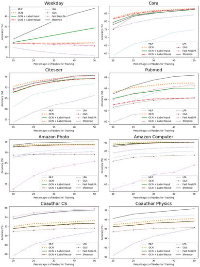 The proportion of labeled nodes in all nodes on a given graph may be crucial for LPA-based methods and 3ference. We experimented with different training sets that cover s percent of all nodes. The results are depicted in Figure 6. On almost all datasets, especially on Pubmed and Weekday Prediction, the curve of 3ference increases about twice as fast as that of GCN + Label Input. The reason behind this is that the Label Input trick has to divide the training set into two parts, causing a waste of resources. Compared against it, 3ference can capture more knowledge from the labels. This ability renders it able to achieve competitive performance with fewer known labels than other methods.