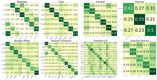 Figure 7. The ground-truth label transition matrices describe the probability of a node with one label connecting to its adjacent node with another label.