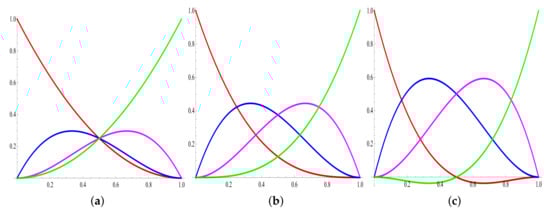Here, m is a positive integer. When the functions become a Ball basis defined by [25], and for equation one represents the Bézier and Timmer basis functions defined in [26,27]. The graphical behavior of the basis functions for different values of m is represented in Figure 2; has been used in this work.