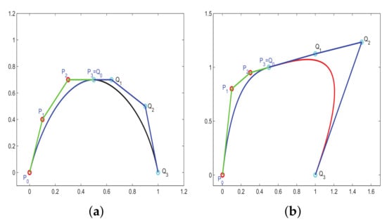 For , continuity reduces to continuity. The graphical representation of geometric continuity between two segments is given in Figure 4.