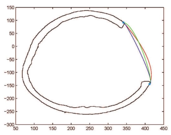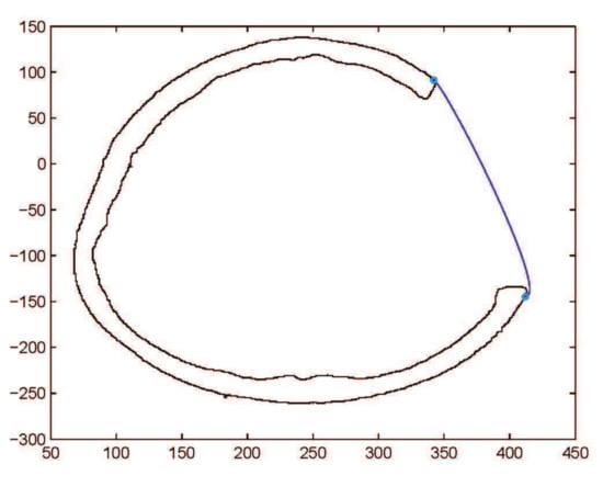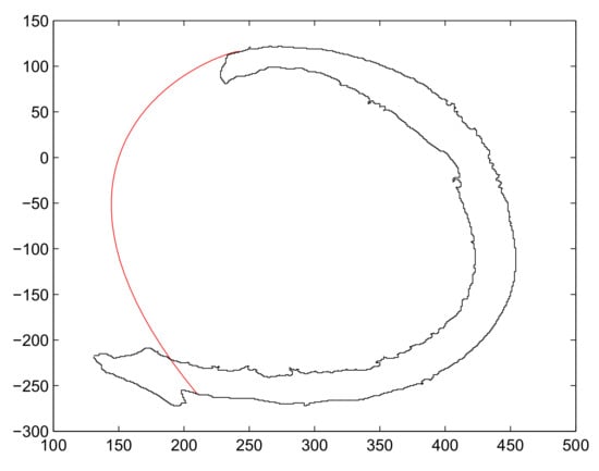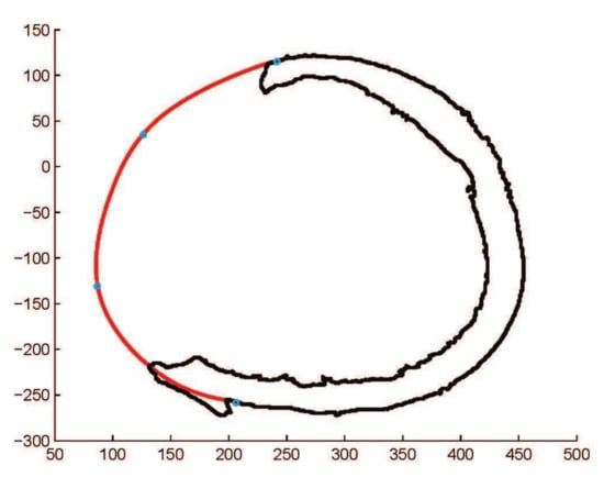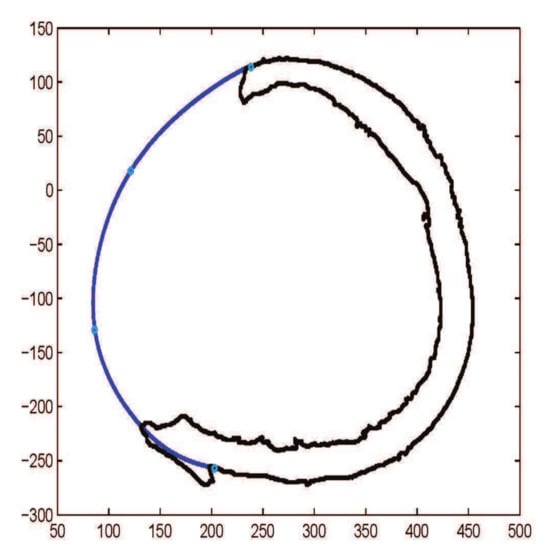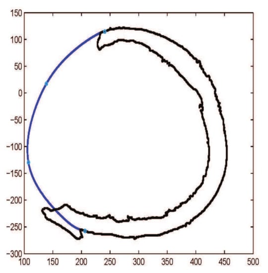 To check the validity of and curves, they are applied to construct the comparatively bigger fractured part, as shown in Figure 16. The results of curve fitting using , curves show the rigidity of the curve resulting in limitation of these methods, as shown in Figure 17, Figure 18 and Figure 19. By dividing the fractured part into segments, the curve become smoother and flexible. The flexibility and smoothness is totally dependent on the number of segments of the fractured part. However, by increasing the number of segments, the required number of control points and and shape parameters are also increased, which is not easy to handle and increases the computational cost.