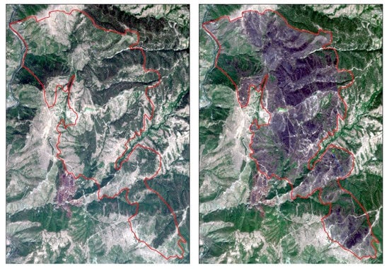The wildfire raged in Kresna Gorge on 24–29 August 2017. At this time, during the summer of 2017, the weather in Bulgaria was very dry and hot. The territory of the fire was located east of the Struma River, mainly on the foot of the slope of Pirin Mountain. The fire spread in a southeast direction and at a certain moment of time the flames were high enough to cross the river that flows through the area. The satellite maps of the area before and after the fire are visualized in Figure 1 [].