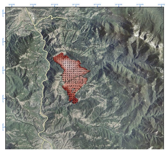 In order to run the simulation in FlamMap, a preliminary processing by WindNinja involving the use of a set of raw stationary meteorological data for wind direction and speed, temperature, cloudiness and their weather parameters compared to spatial terrain data using a digital model were performed. The initial data from WindNinja describe the spatial and temporal changes in wind velocity for the considered period in the area of Kresna Gorge. The necessary input data in FlamMap for the characteristics of the Earth’s surface were derived from the digital model data on the specifics of the terrain (digital elemental model, slope, aspect), the density of the canopy cover, a set of models describing flammable materials for different types of land cover, average height of individual forest areas, canopy base height and canopy stand height of different tree species and the density of the dried and green combustible materials in forest vegetation. Additional data needed to develop the model concern the humidity of the dried and green combustible materials, the ignition point and fire lines, which describe the spatial barriers for the fire front that existed in the field during the first 24 h after the fire.