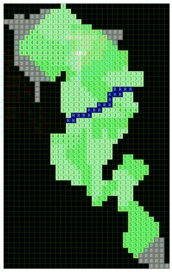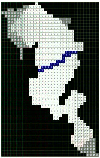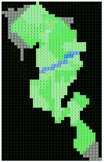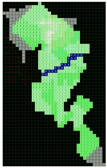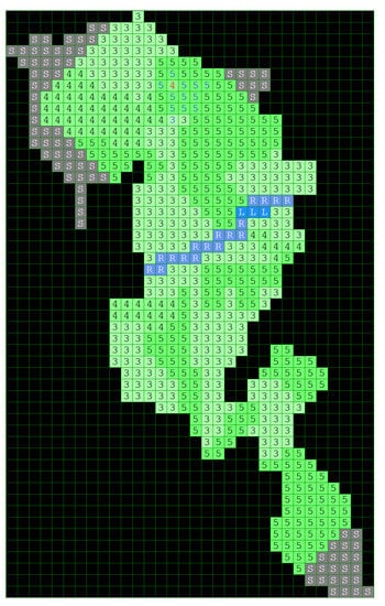 In this paper, the Game Method of Modelling is applied using the available data regarding the propagation of a particular wildfire, that is, the Kresna Gorge on 24–29 August 2017. The investigated area containing the wildfire represents a grid of 540 cells of potentially flammable forest mass, partly surrounded by a rocky terrain. The cells corresponding to the forest mass are assigned here values from 3 to 5 (representing sparse to mid-dense vegetation), and are colored in green. The rocky areas (stones) are marked with the letter S and the gray color of the cells. The river and the lake in the middle of the region where the fire occurred and developed are denoted in the grid by cells colored blue and marked with the letters R and L, respectively.