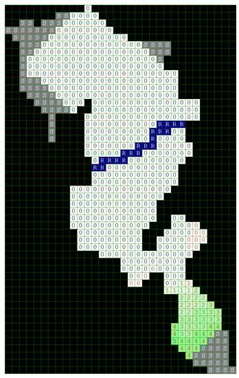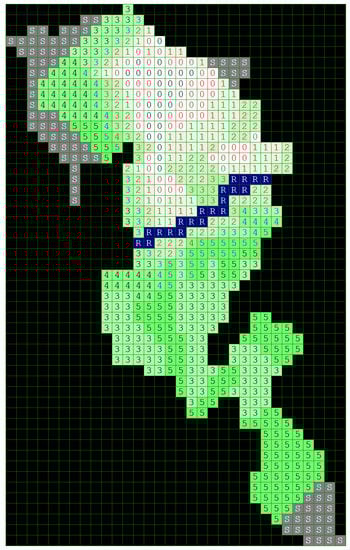 In the present case, the grid of cells represents the forest fire map. The GMM uses a set of objects, represented by symbols that are placed on the vertices on the grid as well as a set of rules A. Each object is represented by a number, an n-tuple of coordinates representing its location in the grid. In the current application, the cells of water are denoted as R for River and L for Lake. The cells representing rocky areas (stones) are denoted by the letter S. These symbols will remain unchanged during the whole simulation. The numbers from 1 to 9 are written in the cells, representing the homogeneity of the grassy and forested area, where the number 1 indicates the presence of thin vegetation like grasses, isolated shrubs or trees, and the number 9 marks the occurrence of very dense vegetation, i.e., highly combustible forest mass. The cells in the grid interact with their adjacent neighbors in the vertical and horizontal—and sometimes diagonal—directions. When a cell is affected by the fire, at each iteration its numerical value decrements by 1, or reaches the number 0 (for a completely devastated area).