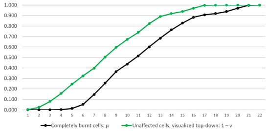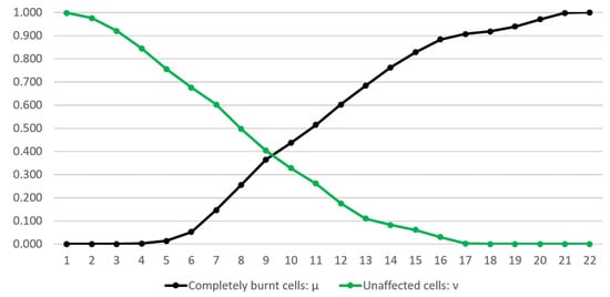 For the i-th iteration we determined the TIFP that represents an ordered pair composed of the degree of the totally burned area (the number of the totally burned cells divided by the number of all cells) and the degree of the yet unaffected area (the number of the unaffected cells divided by the number of all cells) for the whole considered area at that time-moment. Therefore, the remaining intuitionistic fuzzy degree of hesitation (uncertainty), which is equal to the complement of these two degrees to 1, i.e., , corresponds to the number of currently burning cells of the area divided by the number of all cells. Obviously, before the outburst of the fire, the as yet unaffected area is represented as the TIFP , meaning that none of the land has burned and the whole of it is still intact. At the final iteration, when the whole area has been devastated, the respective TIFP’s value is .