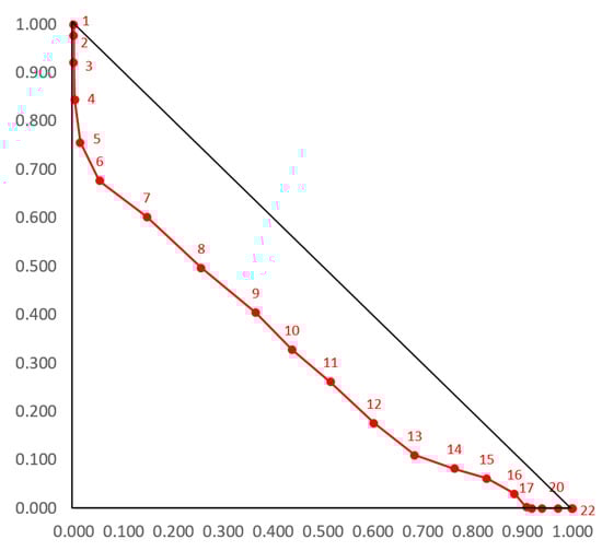 The GMM model corresponds to the real situation before, during and after the end of the real wildfire in Kresna Gorge on 24–29 August 2017. The result corresponds to the one received by FlamMap in Figure 2. Given the use of the intuitionistic fuzzy sets as a tool of evaluation of the modelled process, we will extend our discussion in this direction and present the visualization of the set obtained by the so calculated TIFPs. For this purpose, we will use the two standard visualizations of IFS—the linear and the triangular ones—and for the purpose of better visualizing the belt of hesitation, the linear visualization will be given in both the standard form (Figure 14) and in the modified form (Figure 15).