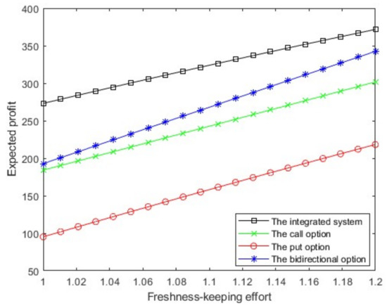 Given the and , we can derive that . Therefore, the expected profit of the retailer is concave in and the optimal freshness-keeping effort of the retailer under the bidirectional option contract should satisfy the follow equation