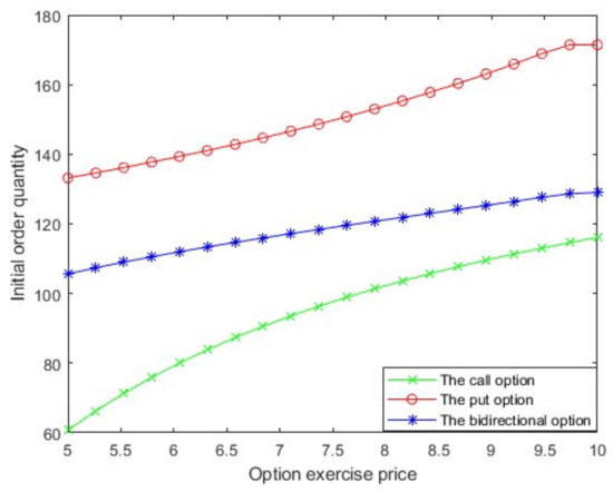 The above discussion demonstrates that a fresh produce supply chain that considers freshness-keeping effort can be coordinated with call, put, and bidirectional option contracts when appropriate contract parameters are set. All of the three option contracts provide flexibility to a decentralized supply chain and reduce the underage or overage risks. We provide comparisons for differences in option price, initial order quantity, option order quantity, and so on in the following.