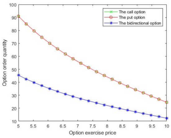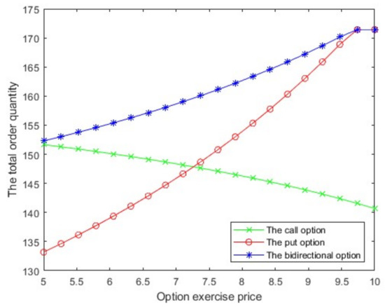 Corollary 4 suggests that the retailer’s optimal total order quantity will increase as the exercise price increases in a fresh produce supply chain with the bidirectional option contract. Exercising a bidirectional option gives the retailer an opportunity to increase revenue. Therefore, the retailer is willing to increase the option order quantity when the exercise price increases, which leads to an increase in the total order quantity.