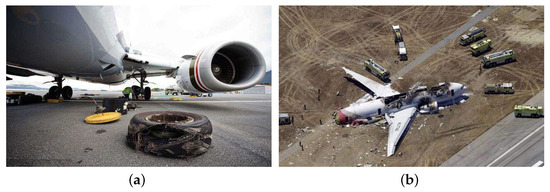 The aircraft anti-skid braking system (ABS) is important airborne equipment. Its function is to stop the aircraft in the shortest distance without skidding or self-locking. It can be seen in Figure 1 that, although the landing phase only accounts for 1% of the entire aircraft operation phase, its accident rate accounts for 26% [1]. Almost every year at home and abroad, there are aircraft accidents caused by brake system failures during takeoff or landing. Data show that the takeoff and landing stages of the aircraft are stages in the flight process with frequent safety accidents. Thus, in addition to good flight characteristics, the aircraft must also have good ground motion characteristics [2,3]. For example, on 27 June 2017, a plane at Tenerife Airport in the United Kingdom suffered a tire puncture when it landed. Some passengers were injured during the evacuation, resulting in the closure of the airport for several hours and thousands of passengers stranded at the airport. Figure 2a shows the incident. In December 2016, a domestic cargo plane ran off the runway when landing at Hangzhou Xiaoshan Airport, as shown in Figure 2b. The front fuselage of the plane was damaged, and some passengers were injured. Later, it was determined that the accident occurred because the runway was slippery, and the brake anti-skid control system did not work properly. It can be seen that the performance of the aircraft braking system directly affects the safety of the aircraft and the people on board. It is required that the brake anti-skid control system must work stably, quickly, and accurately to ensure the safety of the aircraft.