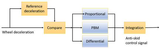 For a strong real-time and highly nonlinear system such as ABS, the unmodeled dynamics and parametric uncertainty may lead to serious performance degradation [23]. Therefore, model-free control technology has gradually attracted the attention of anti-skid system researchers. The model-free control techniques are also labeled as data-driven [24], because a large amount of test data is needed to design the controller. Currently, a pressure-bias-modulated (PBM) aircraft anti-skid braking system is the most commonly used braking system, which is an improved algorithm of PID control. Figure 3 is a schematic diagram of a slip-velocity-controlled, PBM control system, which demonstrates that the only difference between the PBM and PID control algorithms is that the integration module of a PID algorithm is replaced by a PBM module algorithm. It retains the advantages of a simple and easy-to-understand PID controller and does not require an accurate system model of the controlled object. Although a large number of new anti-skid control algorithms have emerged in recent years, it is still the most widely used and installed anti-skid control algorithm.