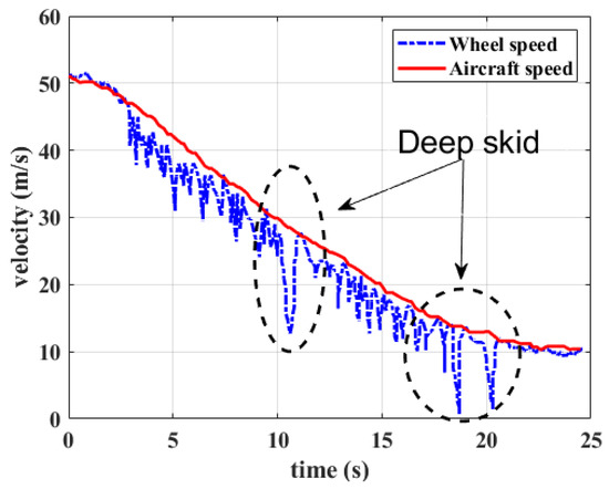 Although the PBM algorithm has a good braking effect under dry runway conditions, when the runway is slippery or icy, it is prone to deep slippage, resulting in low braking efficiency. Figure 4 is the curve of the PBM controller slipping on a slippery runway [25]. A deep skid not only accelerates tire wear and reduces tire life but also easily causes the aircraft to overrun the runway with a braking distance that is too long.