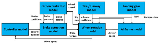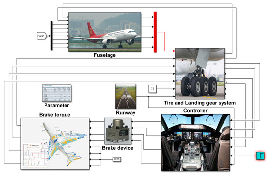 Aircraft brake ground test costs are high and the experimental period is long; so, the design of an aircraft anti-skid braking system usually uses computer simulation to assist the design. Similar to an actual aircraft, the aircraft model used for simulation is also an assembly of many unique subsystems. The relationship between the aircraft braking system dynamics model and the controller model is shown in Figure 5.