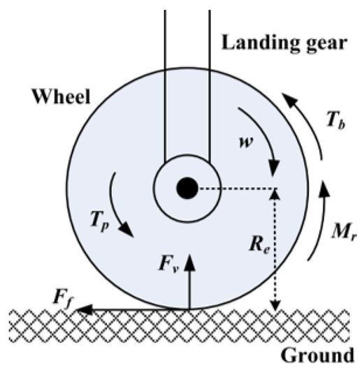 Figure 7 is a schematic diagram of the main wheel of the aircraft, from which we can see that the wheel is mainly subjected to the ground support force, braking force, and the ground friction during the braking process. The rotational dynamics of the main wheel can be described by