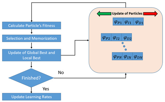 The concept of a PSO algorithm was initially proposed by Kennedy and Eberhart [34] in 1995, and it has been shown to be effective in solving optimization problems [35]. According to Kennedy and Eberhart, each particle represents a candidate solution to the optimization problem. Each particle tracks the optimal solution by moving its position; acceleration is weighted by a random term where separate random numbers are generated for acceleration towards the local best and global best positions [36]. In order to achieve a better learning speed and spare the trial and error process of selecting a suitable learning rate, the particle swarm optimization (PSO) algorithm is used to track the optimal learning rates in real time. The flowchart of the PSO used to adjust the learning rate is shown in Figure 10. In this paper, the particle swarm algorithm is used to find the optimal learning rate of the PID algorithm; so, we chose the learning rate as the coordinate of the example. The optimization goal is to track the optimal slip rate of the system. Thus, the fitness function is constructed using the tracking error between the actual slip rate and the optimal slip rate. The fitness function was chosen as follows: