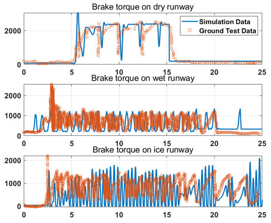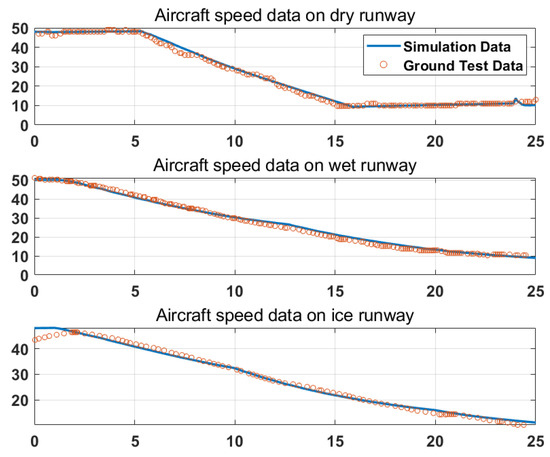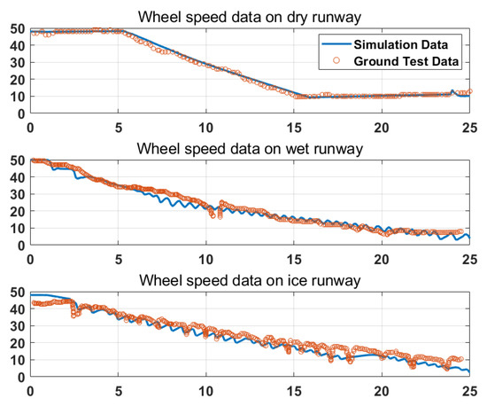 Figure 13, Figure 14 and Figure 15 are the results of comparisons between the simulation data and the ground test data on three commonly used runways. The controllers used in the simulation and the ground test were both PBM controllers. As indicated in the following figures, the simulation results were basically consistent with the experimental results, which indicate that the simulation model built in this paper was suitable for the test of the proposed controller. It is worth mentioning that, though no ice runway results were provided, we can use the experimental results of the flooded runway, because the maximum bonding coefficient and friction characteristics of the road surface were similar to those of the ice runway under the condition of water accumulation.