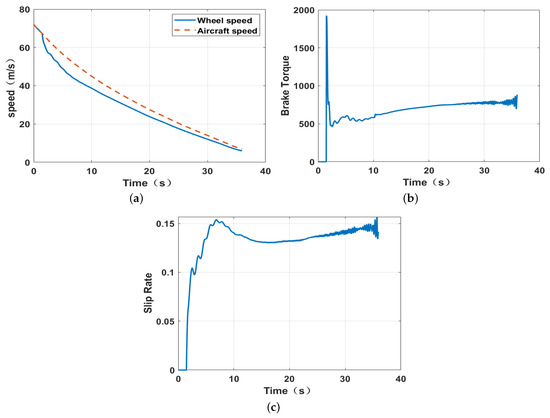 Figure 16 shows the simulation results under the conditions of an ice runway. For the aircraft anti-skid braking control system, the main control goal was to make full use of the friction between the tire and the ground, improve the braking efficiency, and prevent the tire from slipping and locking. Therefore, for the aircraft anti-skid system, the variables we were most concerned about were the speed of the aircraft body, the speed of the wheels, the slip rate, and the braking torque. From the above simulation results, it can be seen that, despite the harshest braking environment, the controller still showed good performance. It can be seen in Figure 16a that, during the entire braking process, there was no deep skid as shown in Figure 4, nor was there any tire lockup. Because the simulation conditions represent the most severe conditions in the industry (i.e., ice runways), we believe that, for the vast majority of logarithmic runway conditions, the controller proposed in this paper can avoid the problem of deep skid or tire locking during the braking process of the aircraft. Furthermore, as can be seen in Figure 16b, the controller can quickly adjust the output braking pressure according to the state of the runway, which means that the particle swarm optimization algorithm we designed can quickly adjust the PID parameters, and its performance can meet the real-time requirements of the anti-skid braking system. Figure 16c depicts that the slip rate of the system can quickly reach 0.12–0.15, which is the optimal slip rate interval, according to [37].