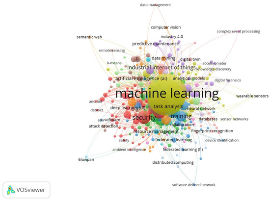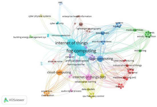 Figure 4, Figure 5 and Figure 6 depict the VOS visualization for the publications in IoT-Fog computing, IoT-machine learning, and IoT-Fog-machine learning environments from a security perspective. VOSviewer is a software tool for constructing and visualizing bibliometric networks (Source: https://www.vosviewer.com/ (accessed on 2 February 2022)). Specifically, 2010–2021 was considered for assessing the research publications. Moreover, for abstracting research papers in the current domain, the Web of Science repository was utilized, as it is the most widely adopted research publication repository. Summarizing the aspects as mentioned above, some of the common Fog vulnerabilities are depicted in Figure 7 (Source: Puthal, D., Mohanty, S. P., Bhavake, S. A., Morgan, G., & Ranjan, R. (2019). Fog computing security challenges and future directions (energy and security) are also discussed (IEEE Consumer Electronics Magazine, 8 (3), 92–96).
