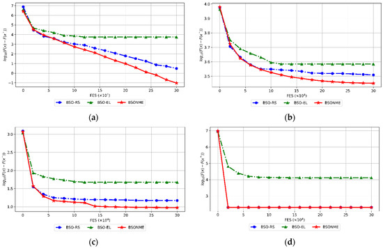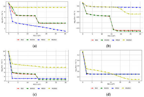 Evolution of the mean errors (in logarithmic scale) of BSO, MBSO, IRGBSO, and BSO-OS versus the number of FES on four test problems. (a) F2; (b) F12; (c) F18; (d) F23.